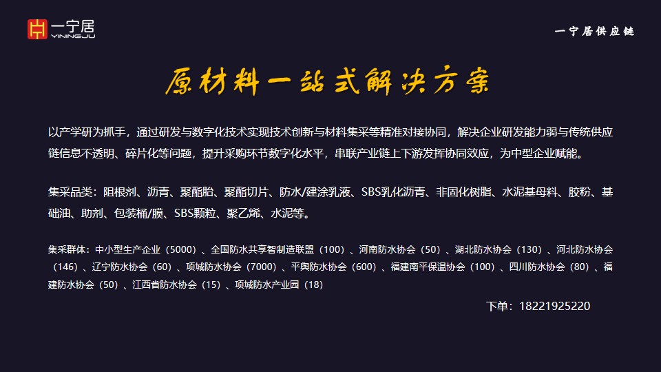 集采品類:瀝青、聚酯胎、聚酯切片、防水/建涂乳液、非固化添加劑、水泥基母料、膠粉、基礎(chǔ)油、助劑、包裝桶/膜、SBS顆粒、聚乙烯、水泥等。