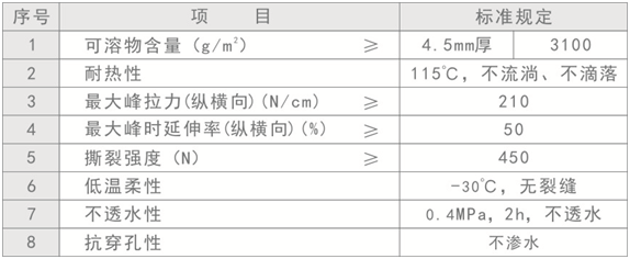 高聚物改性瀝青防水卷材的物理力學(xué)性能指標(biāo)符合TBT2965《鐵路混凝土橋面防水層技術(shù)條件》的要求(見下表)