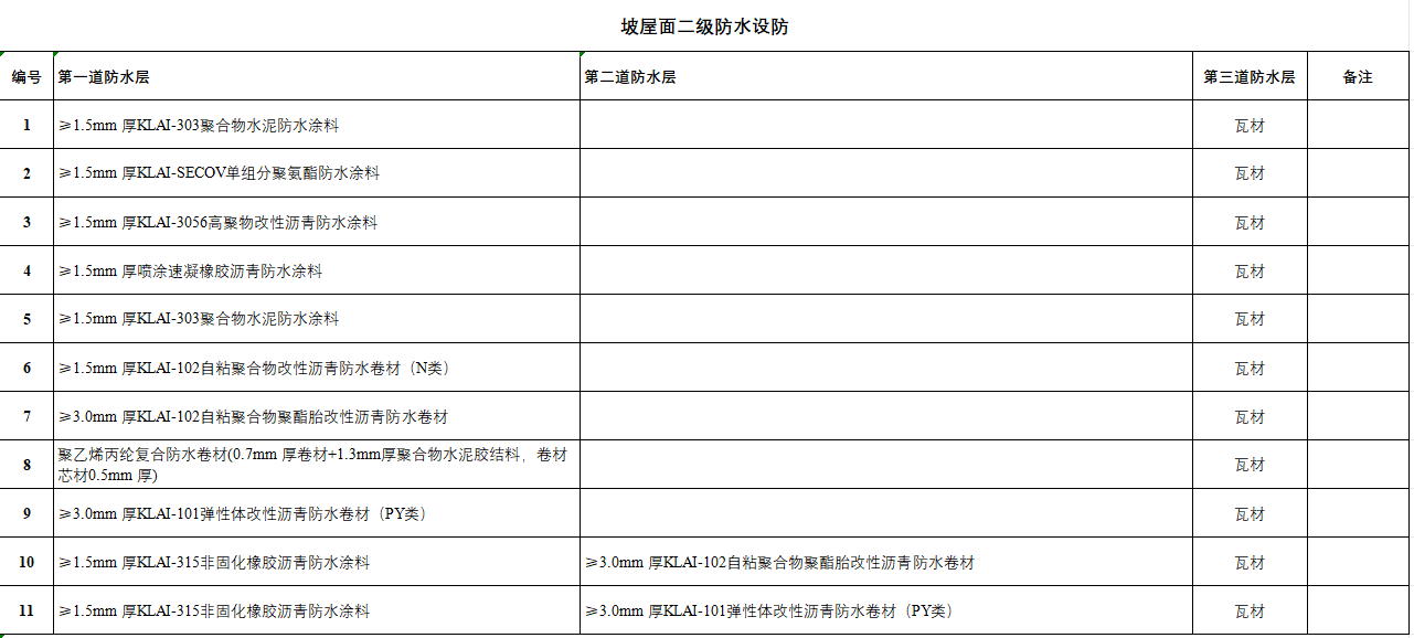 說(shuō)明:1 防水涂料或防水卷材厚度指單道防水層最小厚度;2 當(dāng)采用溶劑型聚氨酯防水涂料與瀝青防水卷材相鄰設(shè)防時(shí),宜設(shè)置 20mm 厚 M15 的水泥砂漿隔離層,其他設(shè)計(jì)方案同;3 耐根穿刺防水卷材的施工方法應(yīng)與耐根穿刺檢測(cè)報(bào)告中注明的施工方法一致;4 粘結(jié)材料與防水卷材共同形成復(fù)合防水層時(shí),應(yīng)單獨(dú)對(duì)粘結(jié)材料進(jìn)行檢測(cè),確保合格;5 當(dāng)聚乙烯丙綸復(fù)合防水卷材、聚乙烯丙綸耐根穿刺復(fù)合防水卷材采用水泥基材料