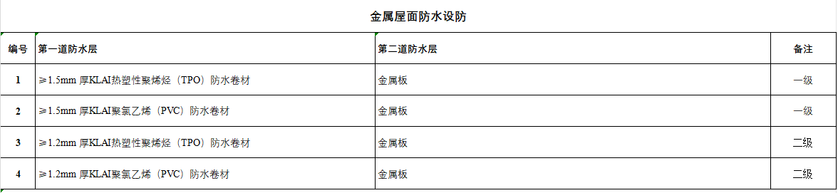 說明:1 防水涂料或防水卷材厚度指單道防水層最小厚度;2 當采用溶劑型聚氨酯防水涂料與瀝青防水卷材相鄰設防時,宜設置 20mm 厚 M15 的水泥砂漿隔離層,其他設計方案同;3 耐根穿刺防水卷材的施工方法應與耐根穿刺檢測報告中注明的施工方法一致;4 粘結(jié)材料與防水卷材共同形成復合防水層時,應單獨對粘結(jié)材料進行檢測,確保合格;5 金屬板包括壓型金屬板和金屬面夾芯板。當前金屬屋面工程中大多選用合成高分