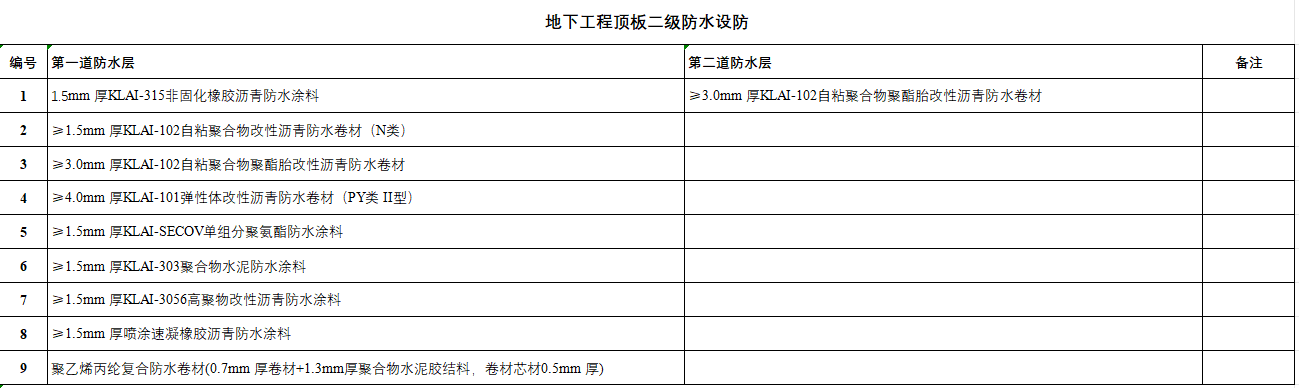 說明:1 防水涂料或防水卷材厚度指單道防水層最小厚度;2 當采用溶劑型聚氨酯防水涂料與瀝青防水卷材相鄰設防時,宜設置 20mm 厚 M15 的水泥砂漿隔離層,其他設計方案同;3 耐根穿刺防水卷材的施工方法應與耐根穿刺檢測報告中注明的施工方法一致;4 粘結材料與防水卷材共同形成復合防水層時,應單獨對粘結材料進行檢測,確保合格;5 當聚乙烯丙綸復合防水卷材、聚乙烯丙綸耐根穿刺復合防水卷材采用水泥基材料