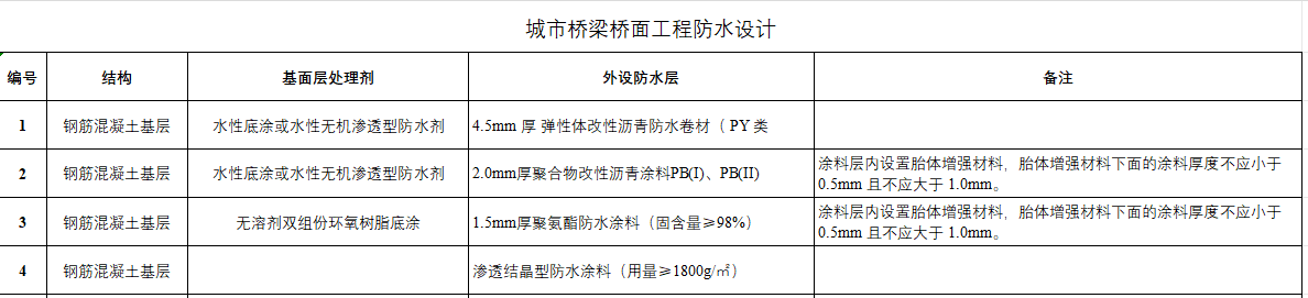 說明:1.橋梁工程防水層施工,應在基層混凝土強度達到設計強度的80%及以上后進行。2.防水施工前,橋面基層混凝土應進行表面粗糙度處理,基層表面的浮灰應清除干凈——常用拋丸打磨處理,并控制表面粗糙度。3.橋面防水層應直接鋪設在混凝土結構表面,不應在二者間加鋪砂漿找平層——砂漿找平層在車輛的碾壓下,易破碎或出現(xiàn)移動,導致防水層破損,影響防水層質量。4.當采用瀝青混凝土鋪裝面層時,防水層應采用防水卷材或