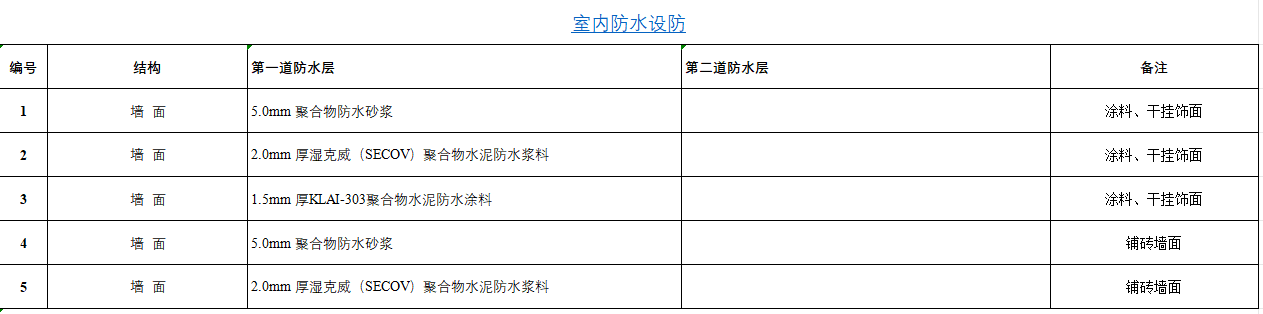 2 室內(nèi)工程一級設(shè)防,規(guī)定防水設(shè)防道數(shù)不應(yīng)少于2道,其中防水卷材或防水涂料不應(yīng)少于1道,主要是考慮到卷材質(zhì)量的可控以及防水涂料在處理管根、地漏等節(jié)點時的便捷,亦可適應(yīng)基層變形帶來的影響;