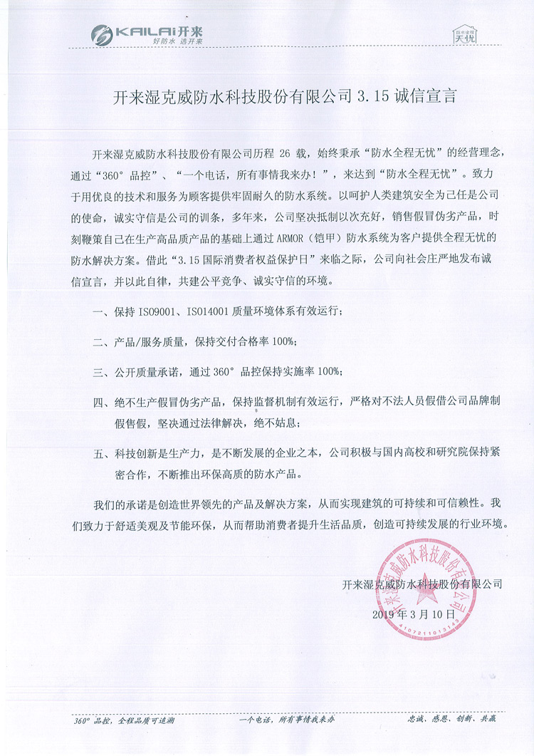 開來濕克威防水科技股份有限公司歷程26載,始終秉承“防水全程無憂”的經(jīng)營(yíng)理念,通過“360°品控”、“一個(gè)電話,所有事情我來辦!”,來達(dá)到“防水全程無憂”。致力于用優(yōu)良的技術(shù)和服務(wù)為顧客提供牢固耐久的防水系統(tǒng)。以呵護(hù)人類建筑安全為己任是公司的使命,誠(chéng)實(shí)守信是公司的訓(xùn)條,多年來,公司堅(jiān)決抵制以次充好,銷售假冒偽劣產(chǎn)品,時(shí)刻鞭策自己在生產(chǎn)高品質(zhì)產(chǎn)品的基礎(chǔ)上通過ARMOR(鎧甲)防水系統(tǒng)為客戶提供全程無憂的防水解決方案。借此“3.15國(guó)際消費(fèi)者權(quán)益保護(hù)日”來臨之際,公司向社會(huì)莊嚴(yán)地發(fā)布誠(chéng)信宣言,并以此自律,共建公平競(jìng)爭(zhēng)、誠(chéng)實(shí)守信的環(huán)境。