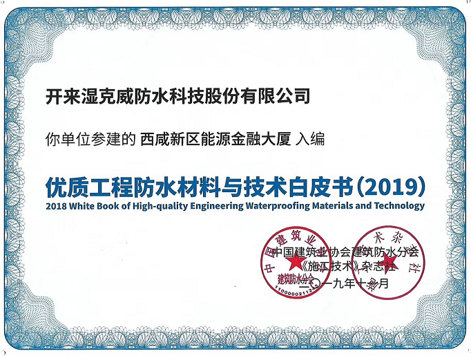 開來濕克威優(yōu)質(zhì)工程入選 《優(yōu)質(zhì)防水工程材料與技術(shù)白皮書(2019版)》