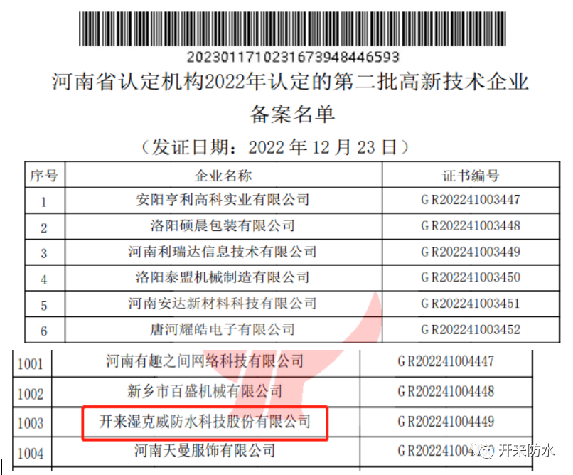 近日,開來濕克威防水科技股份有限公司順利通過《高新技術(shù)企業(yè)認(rèn)定管理辦法》(國科發(fā)火字〔2016〕32號(hào))和《國家高新技術(shù)企業(yè)認(rèn)定管理工作指引》(國科發(fā)火字〔2016〕195號(hào))有關(guān)規(guī)定,在科技部火炬高技術(shù)產(chǎn)業(yè)開發(fā)中心于關(guān)于對(duì)河南省認(rèn)定機(jī)構(gòu)2022年認(rèn)定的第二批高新技術(shù)企業(yè)進(jìn)行備案的公示名單中,開來濕克威防水科技股份有限公司正式被評(píng)定為國家級(jí)高新技術(shù)企業(yè)!