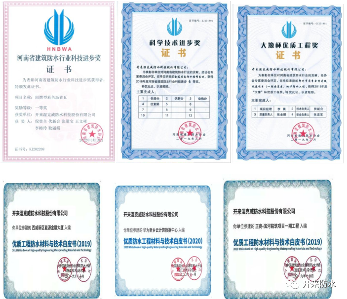 公司開展的研發(fā)多項(xiàng)成果獲得行業(yè)領(lǐng)域的高度評(píng)價(jià),其中“阻燃型彩色瀝青瓦”成果榮獲河南省建筑防水協(xié)會(huì)2021年度科技進(jìn)步一等獎(jiǎng);“金屬屋面防水修繕系統(tǒng)”獲得河南省建筑防水協(xié)會(huì)頒發(fā)的科技進(jìn)步獎(jiǎng)一等獎(jiǎng),“鄭州市崗李合村并城改造項(xiàng)目(一期安置區(qū))地下防水工程”成果榮獲河南省建筑防水協(xié)會(huì)“大豫杯”優(yōu)質(zhì)工程獎(jiǎng),西咸新區(qū)能源金融大廈、華為新鄉(xiāng)云計(jì)算數(shù)據(jù)中心、正商·濱河銘筑一期工程分別入選中國建筑業(yè)協(xié)會(huì)建筑防水分會(huì)和建筑施工技術(shù)雜志社辦法的優(yōu)質(zhì)工程防水材料與技術(shù)白皮書。開來濕克威的知名度和行業(yè)影響力得到快速提升。